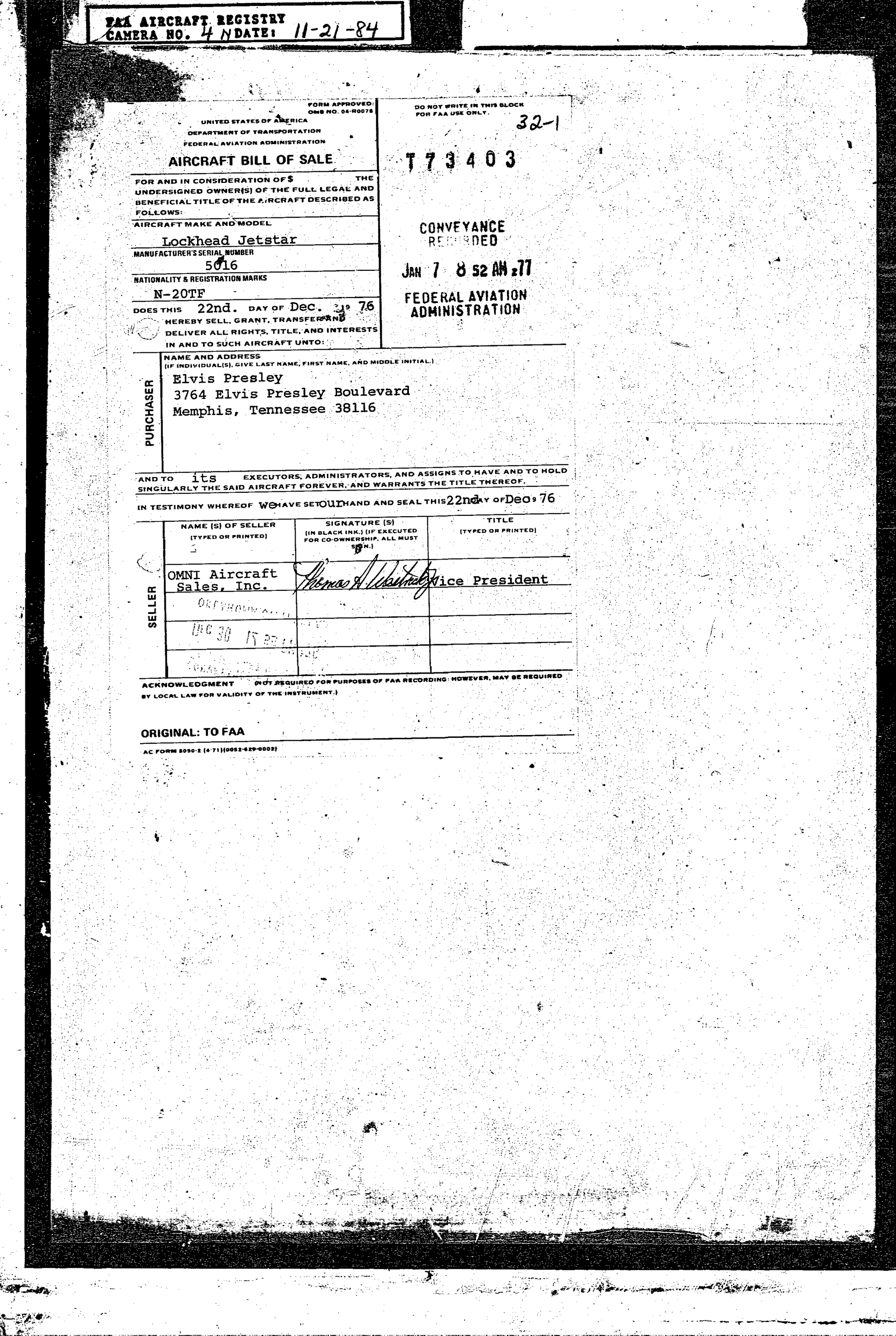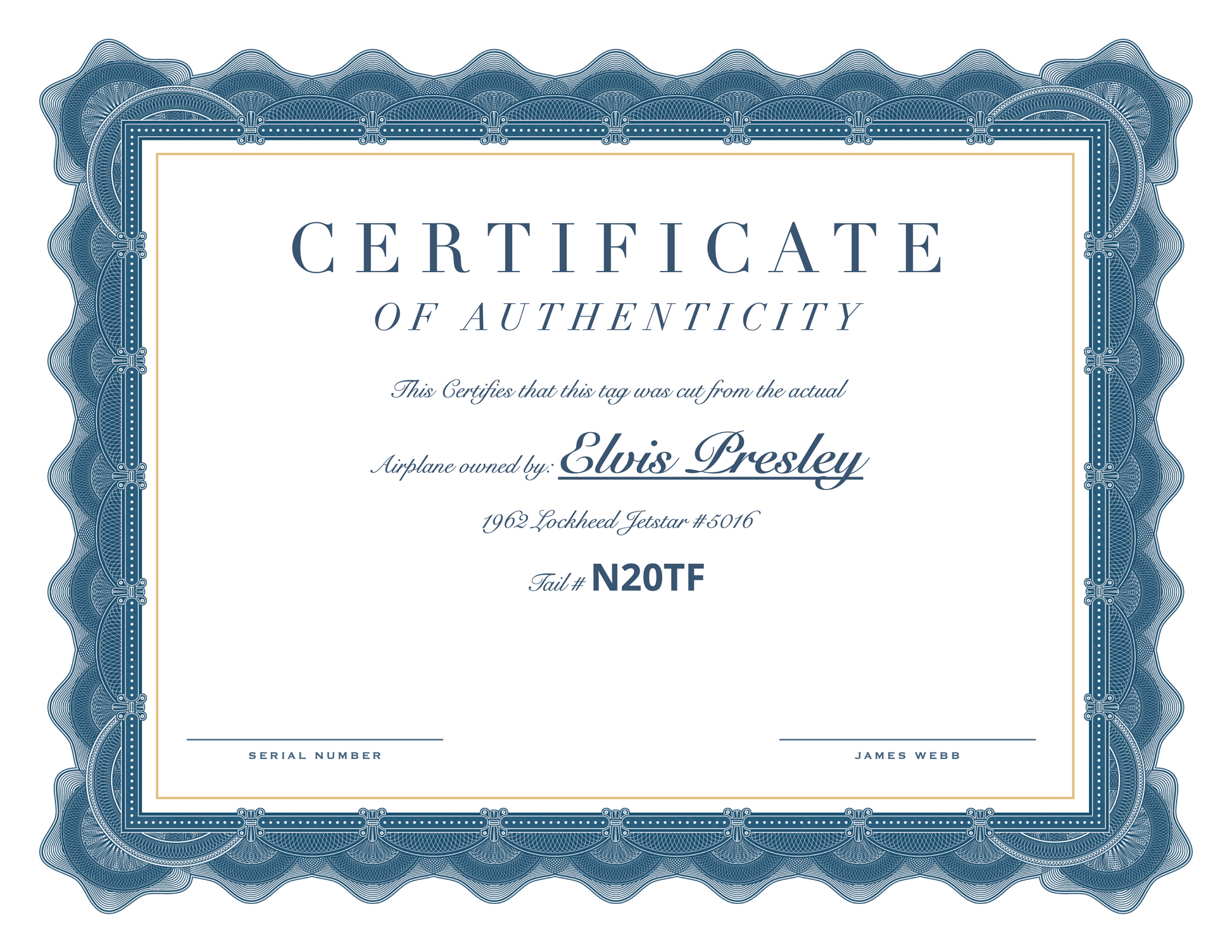 This is an actual piece of the Jetstar owned by Elvis Presley, each one is serial numbered and comes with a hand signed certificate of Authenticity and a copy of the FAA Bill of Sale showing Elvis Presley owned it.